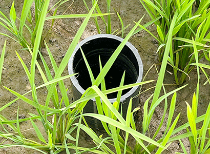 A tube is inserted into the ground to monitor the underground water level. The rice is not submerged in water but the ground still has sufficient moisture, in line with the Alternate Wetting and Drying method.